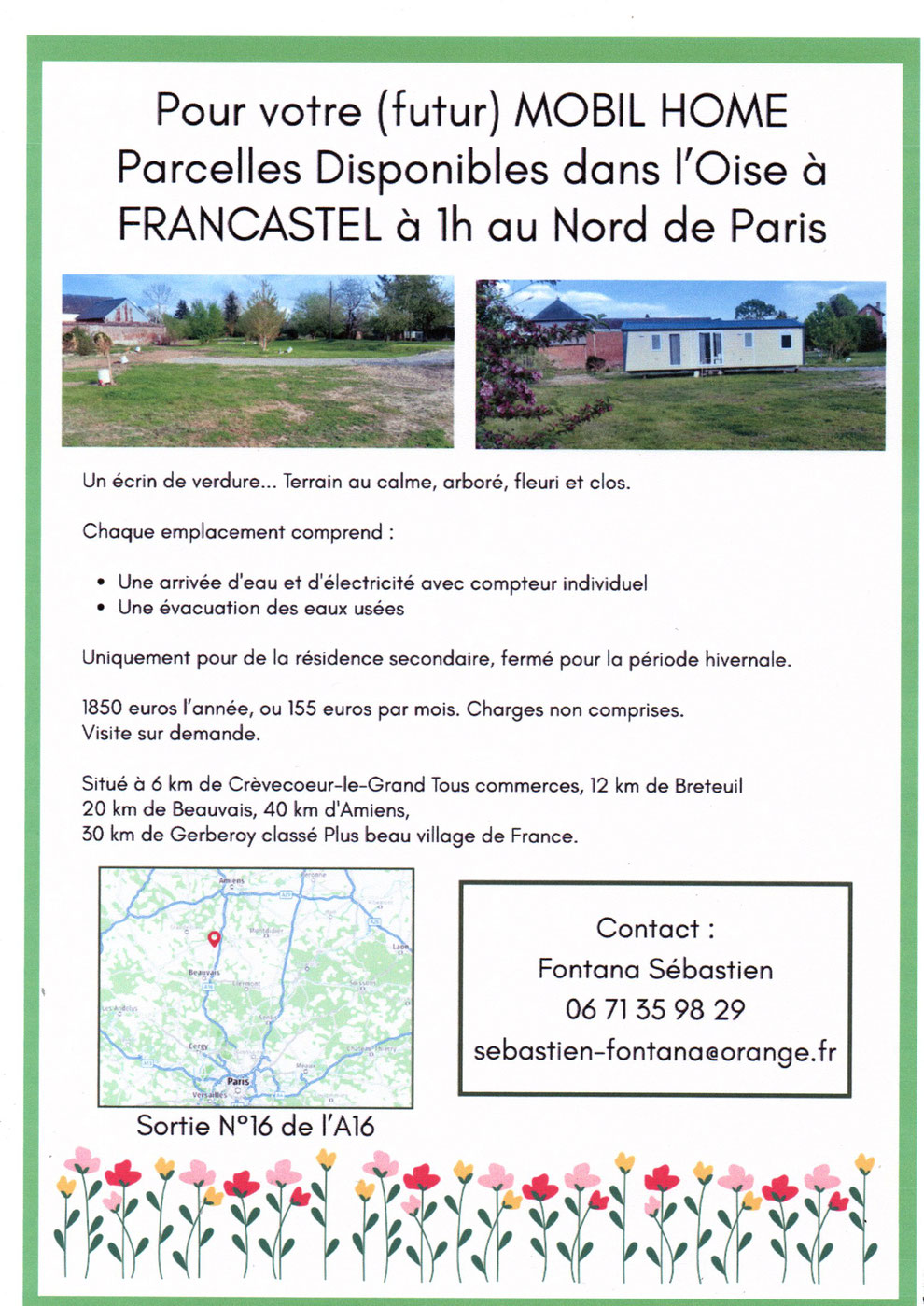 Situé sur la commune de Francastel, nous disposons d'un terrain arboré, équipé de 6 emplacements avec chacun leur branchement électrique et évacuation des eaux usées pour accueillir votre Mobil-Home, Tiny House ou HLL.